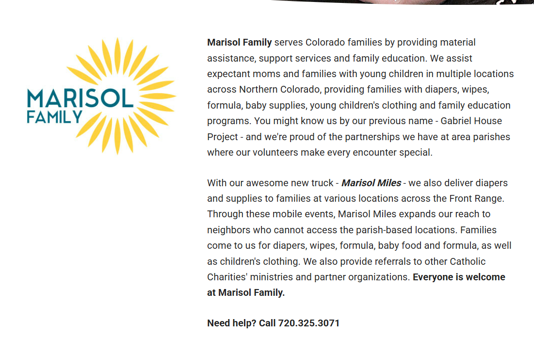 Marisol Family serves Colorado families by providing material assistance, support services and family education. We assist expectant moms and families with young children in multiple locations across Northern Colorado, providing families with diapers, wipes, formula, baby supplies, young children's clothing and family education programs. You might know us by our previous name - Gabriel House Project - and we're proud of the partnerships we have at area parishes where our volunteers make every encounter special.